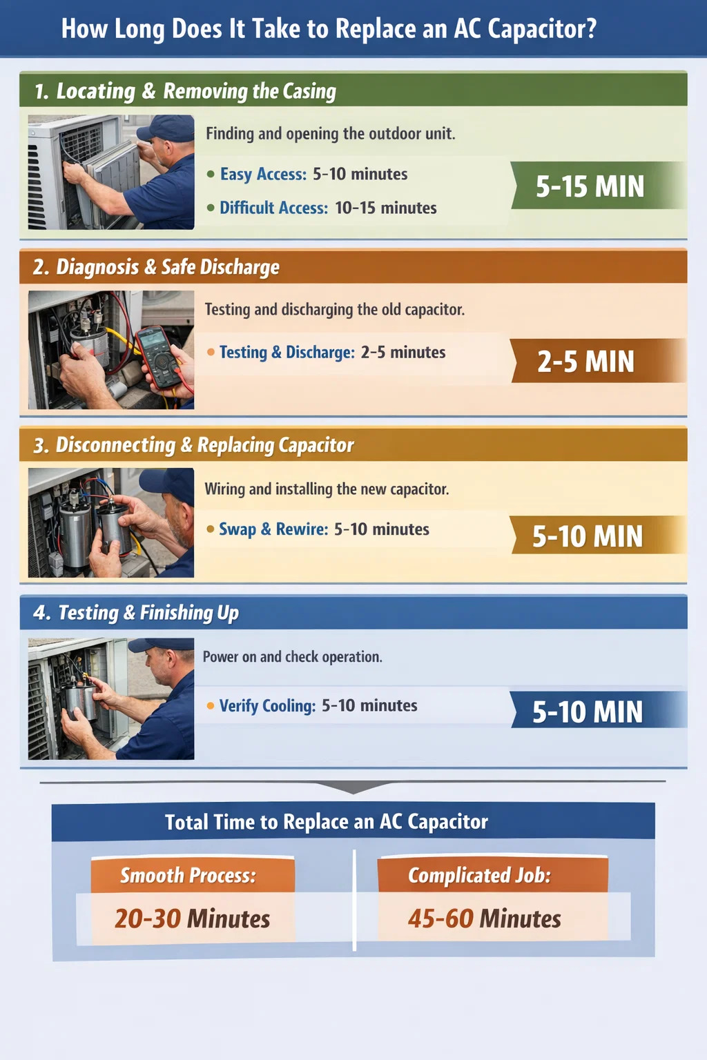 Hvor lang tid tager det egentlig at udskifte en AC kondensator ? Hvis du kun ser de få minutter, teknikeren arbejder, synes du måske, at jobbet er overraskende hurtigt. Men fra det øjeblik, teknikeren ankommer, til klimaanlægget blæser kold luft igen, er der en komplet proces involveret.
