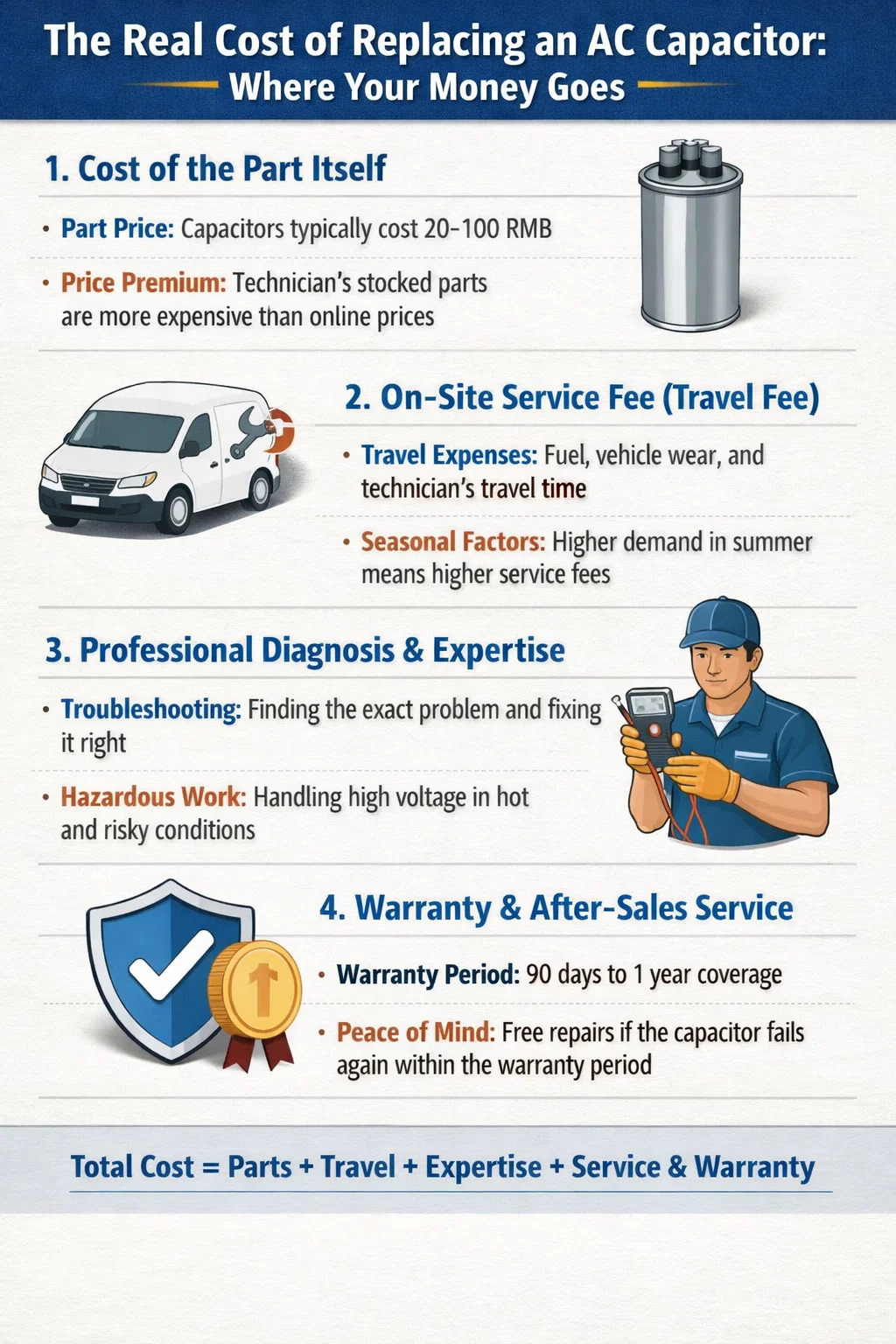 Hvor meget koster det egentlig at udskifte en AC-kondensator? Mange mennesker ser, at små metaldåser kun sælges for et par tiere af yuan online, men reparatørens regning kommer på flere hundrede yuan, hvilket efterlader dem urolige.