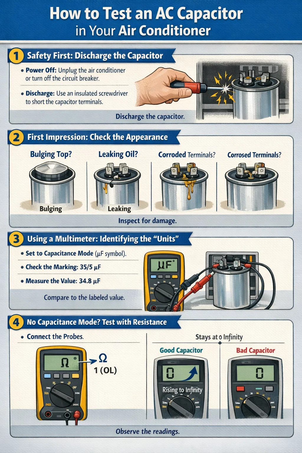At afgøre, om en AC-kondensator i et klimaanlæg er god eller dårlig, kræver ikke professionel elektronikteknisk viden. Så længe du har et multimeter med en "kapacitanstest" funktion, kan du følge disse trin og selv blive semi-ekspert.