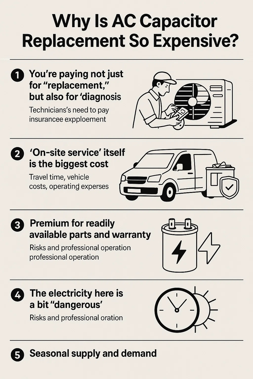 Mange mennesker, der har fået udskiftet deres klimaanlægskondensatorer, har sandsynligvis undret sig: Hvorfor er det, at denne lille cylindriske del – AC kondensator – er det så billigt, når jeg søger efter det på nettet, men regningen er flere gange højere, når en tekniker kommer for at erstatte det?